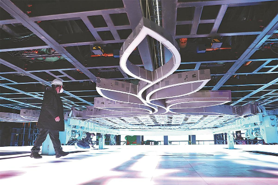Workers check the cauldron platform on Jan 28. ZOU HONG/CHINA DAILY
