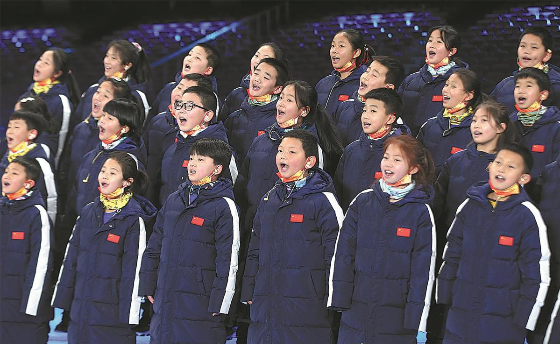 Students from Fuping, Hebei province, a mountainous area lifted out of poverty two years ago, sing the Olympic anthem at a rehearsal on Jan 26. ZOU HONG/CHINA DAILY