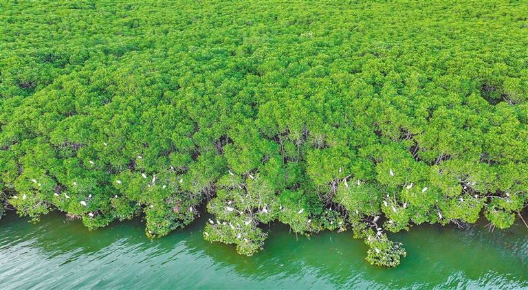 Lingshui Mangrove National Wetland Park, with over 400 acres of mangrove forest coverage, looks like a huge oasis in the sea when seen from the air.