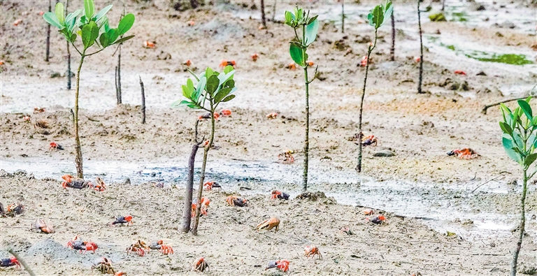 Fiddler crabs foraging under the mangrove saplings in Danzhou’s Xinying Bay wetland. CHEN YUANCAI