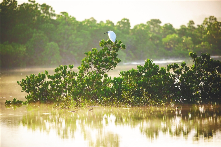 An egret perched on a mangrove branch at the Hainan Xinying Mangrove National Wetland Park. LI TIANPING