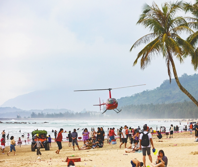 Tourists enjoy a helicopter tour of the beautiful scenery in Wanning's Shimei Bay, on 22 January. [Yuan Chen/Hainan Daily]