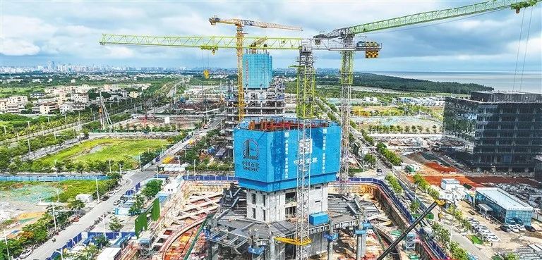 The central tower of the Sinopec Free Trade Building is seen under construction in this recent photo taken in the Jiangdong New Area CBD. (Photo: New Hainan App)
