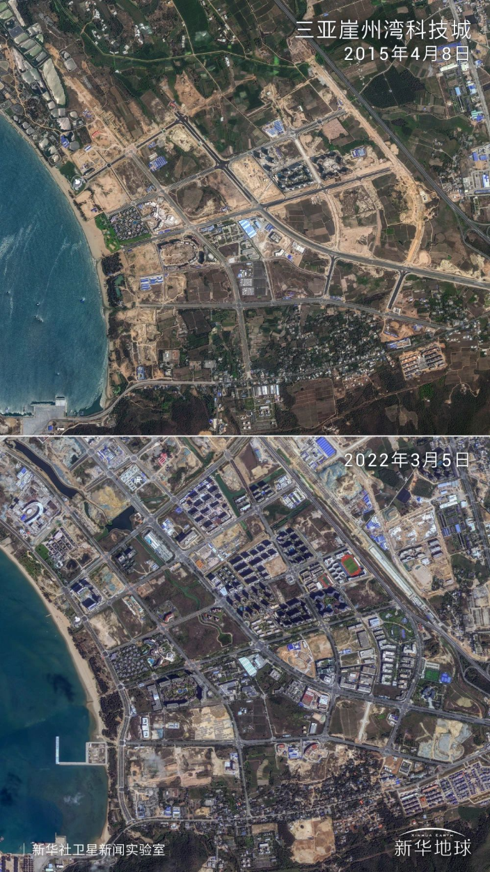 Satellite photos of Sanya Yazhou Bay Sci-Tech City taken on April 8, 2015 (upper) and Mar. 5, 2022 (lower). (Photo: Xinhua)