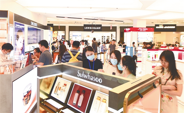 Shoppers purchase items at the CDF Haikou Duty Free Shop at Mova Mall.(Photo: Hainan Daily)
