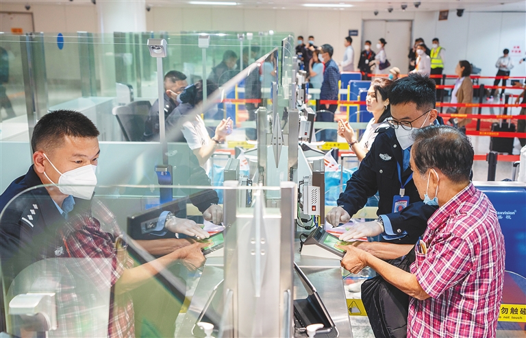 Staff at Haikou’s Meilan International Airport assist travelers with visa-free entry procedures. (Photo: Hainan Daily)