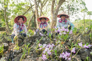 In Shicha Village, the stones themselves have come alive! Purple and white orchid blossoms rise from the volcanic rocks, tumbled down from the ancient extinct volcano that juts from the earth here.The rocks were used by the villagers of ancient times to build sturdy homes that still stand, and are now the perfect cradle for the growing local orchid cultivation industry.