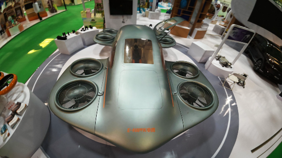 Various high-tech products are on display at the 6th CICPE, including this UFO-shaped electric flying car developed by E-Hawk. (Photo provided by the CICPE Online News Information Center)