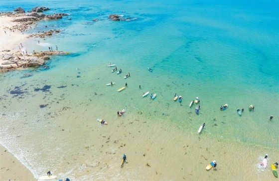 Surfers at Shimei Bay in Wanning. (Photo: Li Tianping / Hainan Daily)