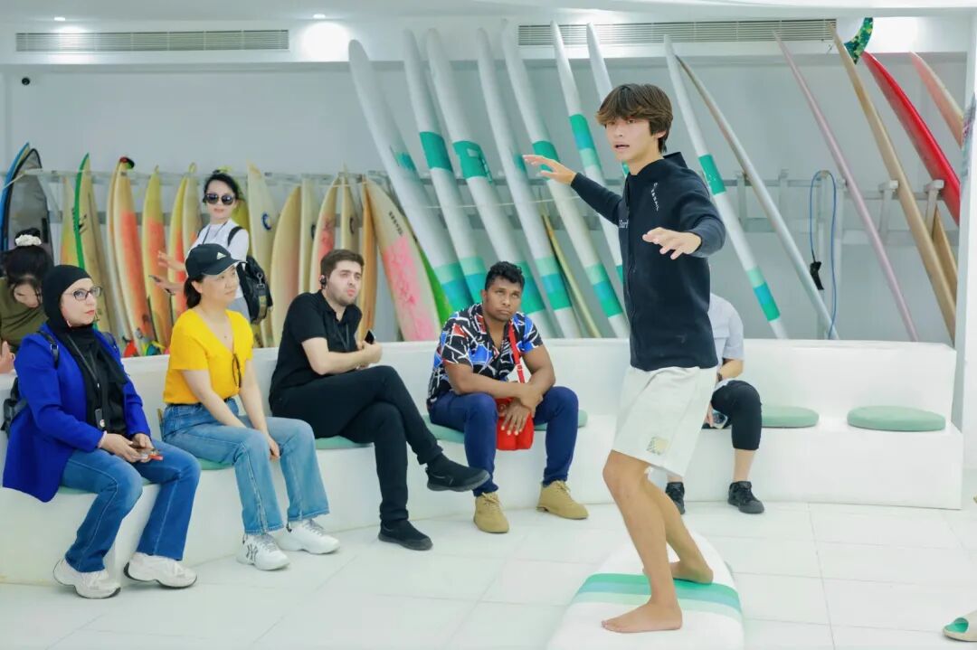 A coach is showing surfing skills to the Global South media delegates. (Photo by Hinews)