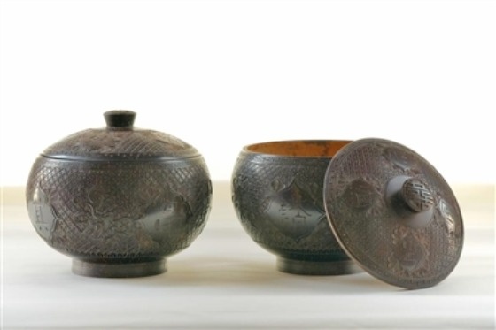 Carved coconut wedding gift containers made by Wu Mingju, a highly regarded Hainan artisan. Photo: Wang Yiyou