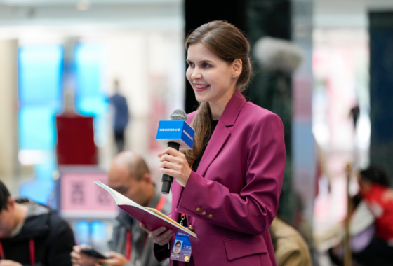 Polina, a full-time Russian host for the Hainan International Media Center, asks a question during the "Director-Generals' Passage" at the Hainan Provincial "Two Sessions." Like many international talents, Polina has worked in Hainan media for over three years, sharing the Hainan FTP story with the world from a unique third-party perspective. (Photo: Nanhai Net / Li Hao)