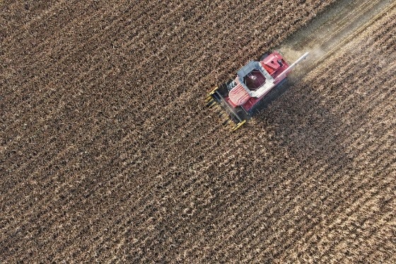 A drone photo taken on Oct. 11, 2025 shows a harvester working in a field of Sifangshan Farm Co., Ltd. of Beidahuang Group in Zhaodong City, northeast China's Heilongjiang Province.(Xinhua/Wang Song)
