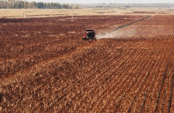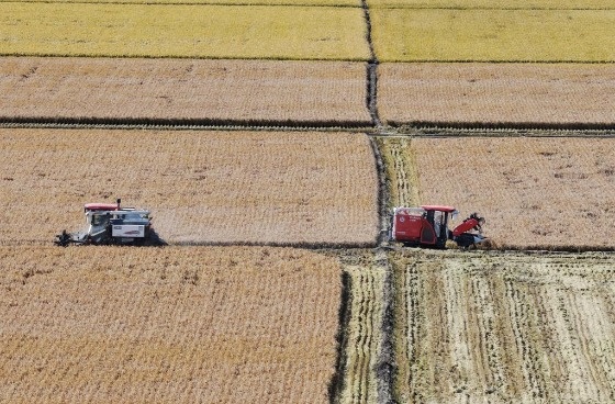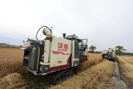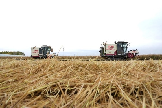 Harvesters work in a field of Yanjiagang Farm Co., Ltd. of Beidahuang Group in Harbin, northeast China's Heilongjiang Province, Oct. 11, 2025.(Xinhua/Wang Song)