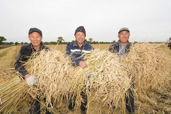 Farmers pose for a group photo with harvested rice in a field of Yanjiagang Farm Co., Ltd. of Beidahuang Group in Harbin, northeast China's Heilongjiang Province, Oct. 11, 2025. (Xinhua/Wang Song)