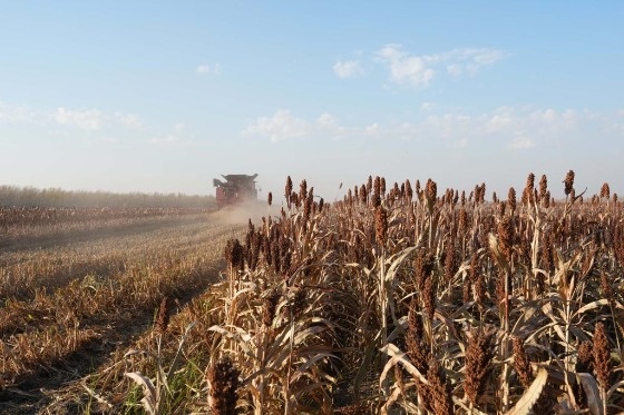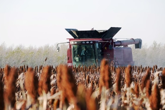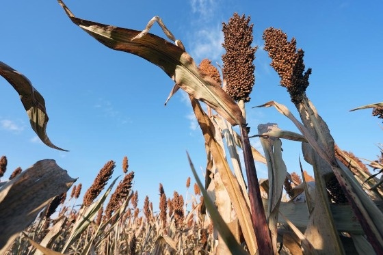 This photo taken on Oct. 11, 2025 shows maturing sorghum ears in a field of Sifangshan Farm Co., Ltd. of Beidahuang Group in Zhaodong City, northeast China's Heilongjiang Province. (Xinhua/Wang Song)