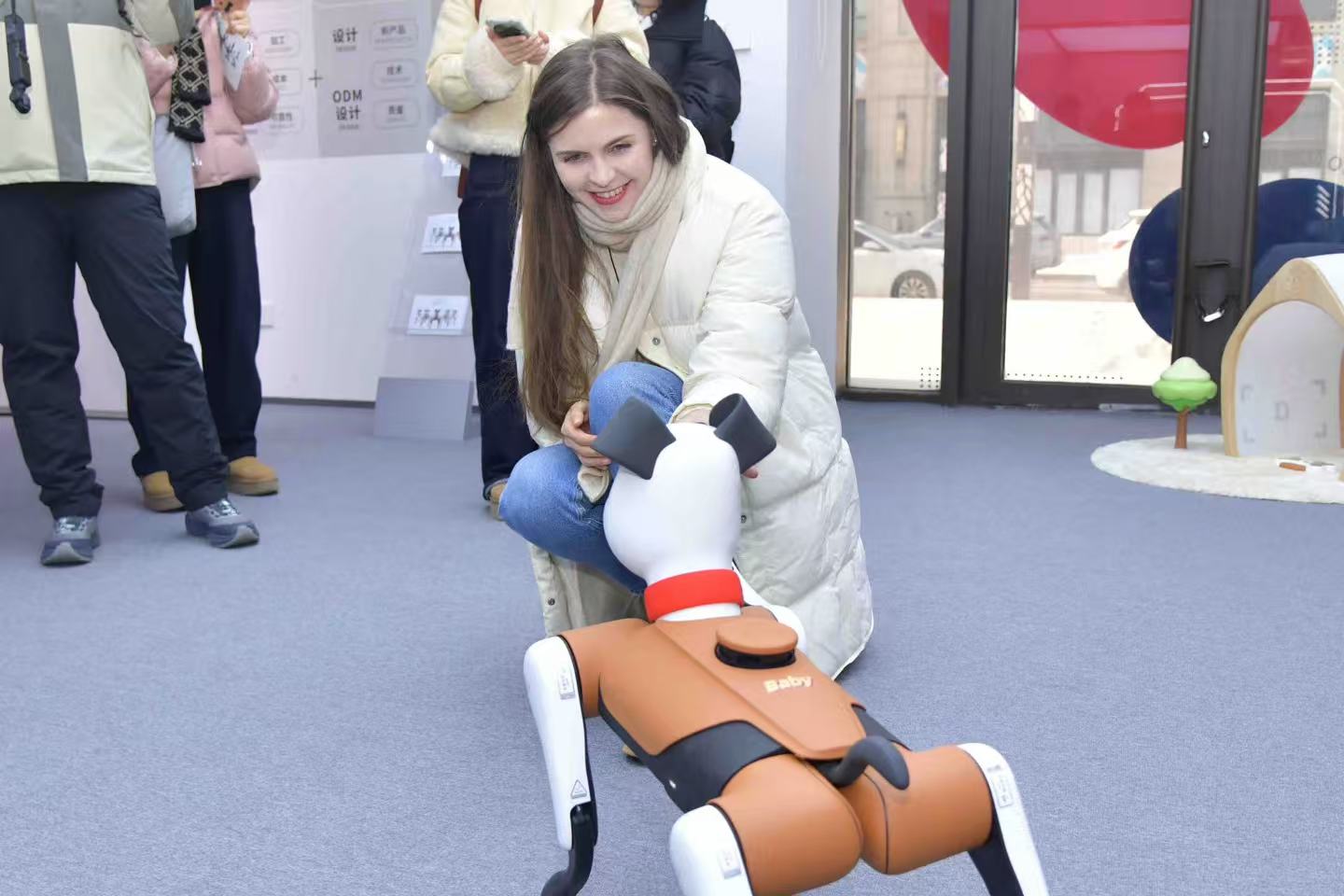 Polina Silicheva, a Russian media anchor based in China, play around with a BabyAlpha Robotic Dog. (Photo: Heilongjiang Daily)