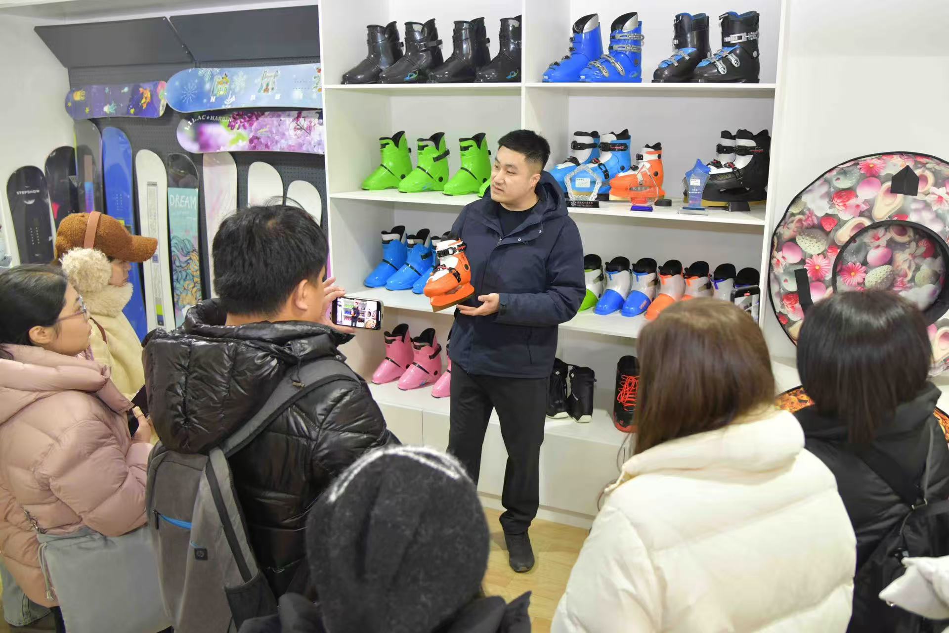 Li Zhibo introduces the winter sports equipment manufactured by his company to the visitors. (Photo: Heilongjiang Daily)
