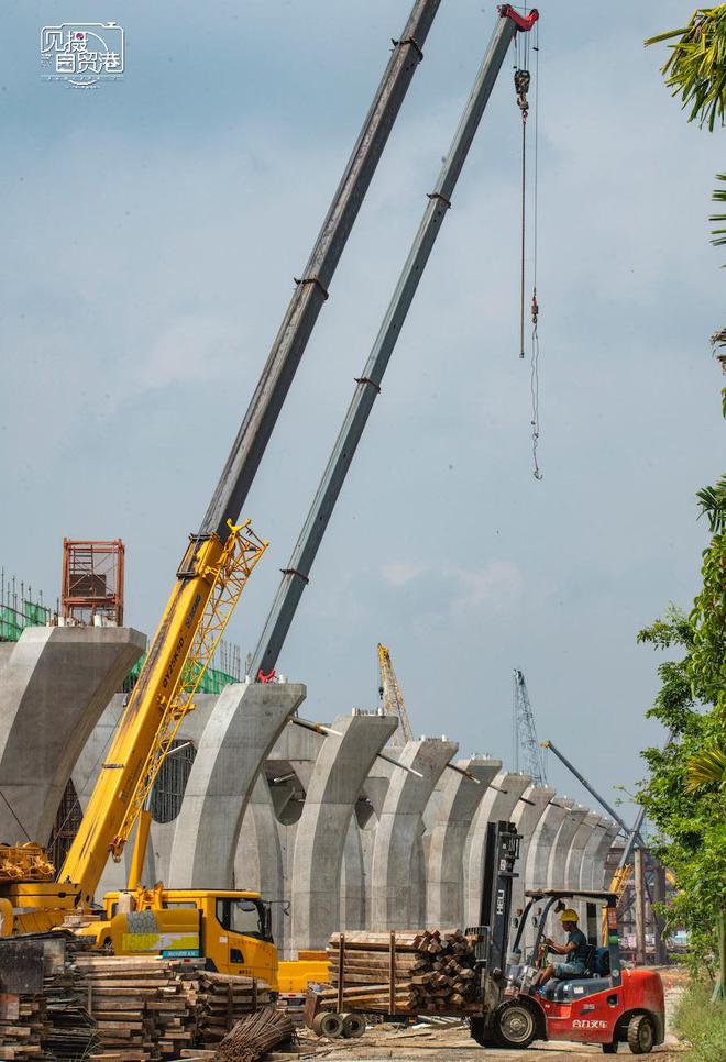 Construction on the Lecheng Bridge, the first suspension bridge in China’s south Hainan Province and a landmark project in the Boao Lecheng International Medical Tourism Pilot Zone (also known as Boao Hope City), in Bo'ao Town, Qionghai City, near the main area of the Boao Forum for Asia, is progressing smoothly.