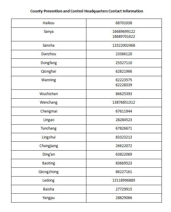 Screening for COVID-19 is required for those arriving in Hainan who have traveled through or stayed in Qingdao after September 27. Arrivals should call the County Prevention and Control Headquarters advisory hotline (see the attached file below) to report relevant information.