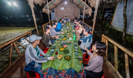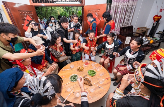 Cultural Researchers taking part in a “long table banquet” in Qiongzhong’s Zahan Village (Photo: Li Hao / Hinews)